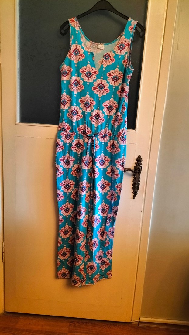 Turkuaz renkli, renkli tie-dye desenli uzun tulum. V yakalı, kolsuz ve bol kesimdir. Belde kemer detayı vardır, günlük kullanım için uygundur.