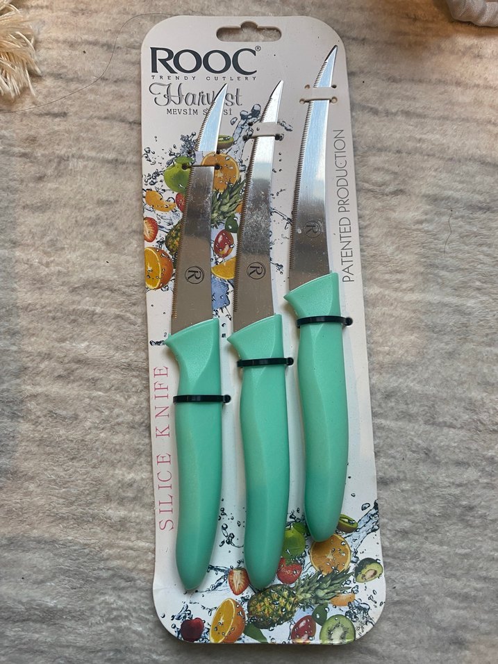 Pastel turkuaz renkte, ergonomik saplı 3'lü meyve bıçağı seti. Keskin bıçaklar meyve dilimlemek için uygundur. Marka ROOC ambalajda yer alır.