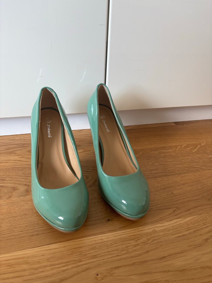 Hiç kullanılmadı. Sentetik malzeme, platformlu model. Normal bir 39 kalıbı. İçten genişlik 8, uzunluk 25.5 cm Turkuaz rugan stiletto topuklu ayakkabılar, minimal ve parlak tasarımlı, klasik ve zarif ofis şıklığı için ideal. Düz yüzeyiyle zahmetsiz şıklık katıyor.