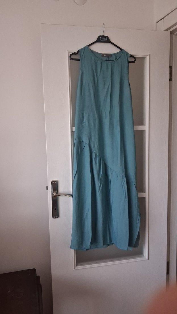 Turkuaz renkte, kolsuz ve salaş kesim uzun elbise. Drapeli tasarım ve yuvarlak yakaya sahiptir. omuzdan uzunluğu 125 cm,iki kol arası 50 cm yırtmaçlı boyu 33 cm