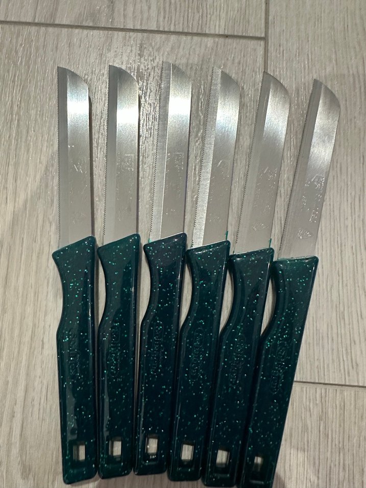 Paslanmaz çelik bıçaklara sahip, koyu turkuaz saplı 6'lı bıçak seti. Mutfakta kullanıma uygundur. Orjinal ürün dür