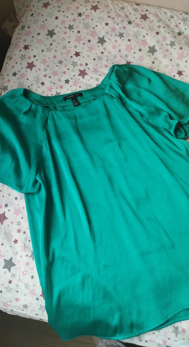 Parlak yeşil, saten görünümlü kısa kollu bluz, salaş ve drapeli kesimiyle rahat ve şık bir görünüm sunar. Tek renk, tekne yaka detaylı.