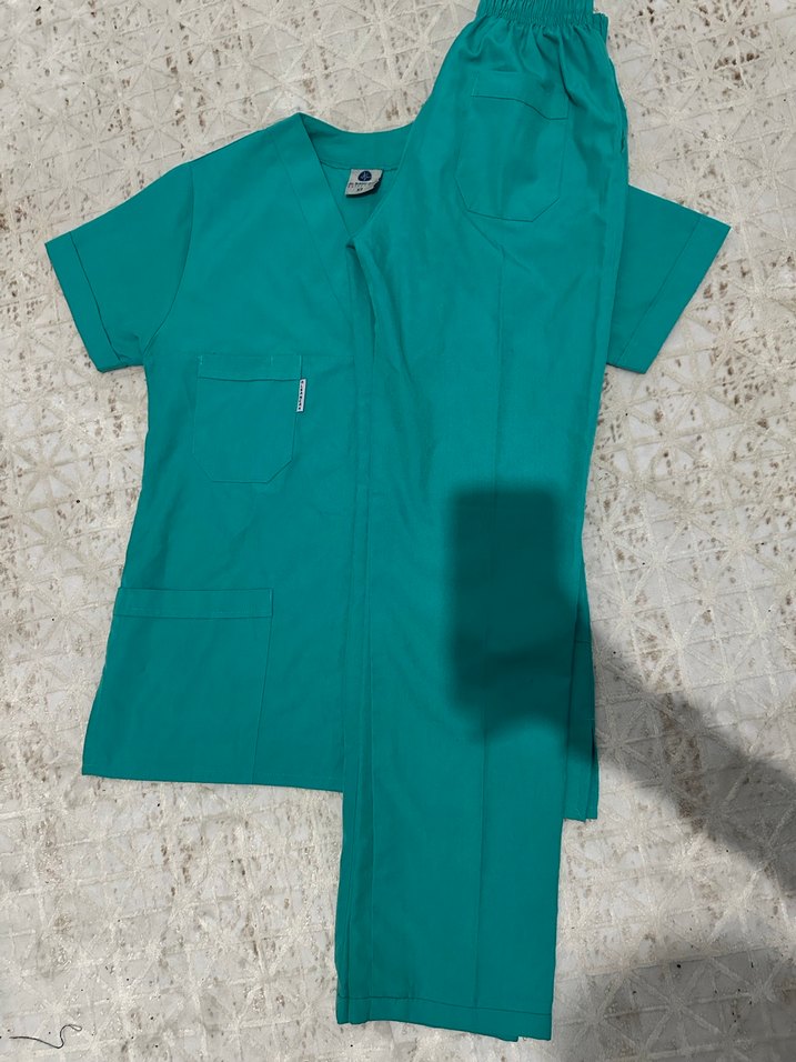 Turkuaz renkli, kısa kollu hastane kıyafeti. Üründe hiçbir kusur yoktur. 45kg civarına uygundur