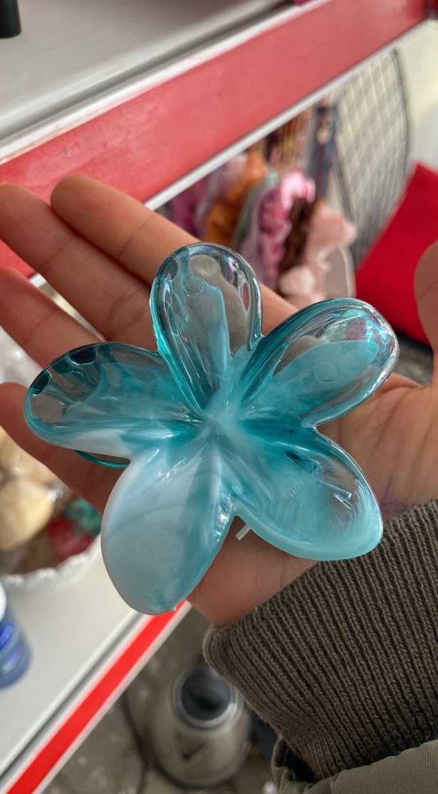 Turkuaz şeffaf camdan yapılmış çiçek şeklinde saç tokası, minimal ve avangart tarz için uygun.