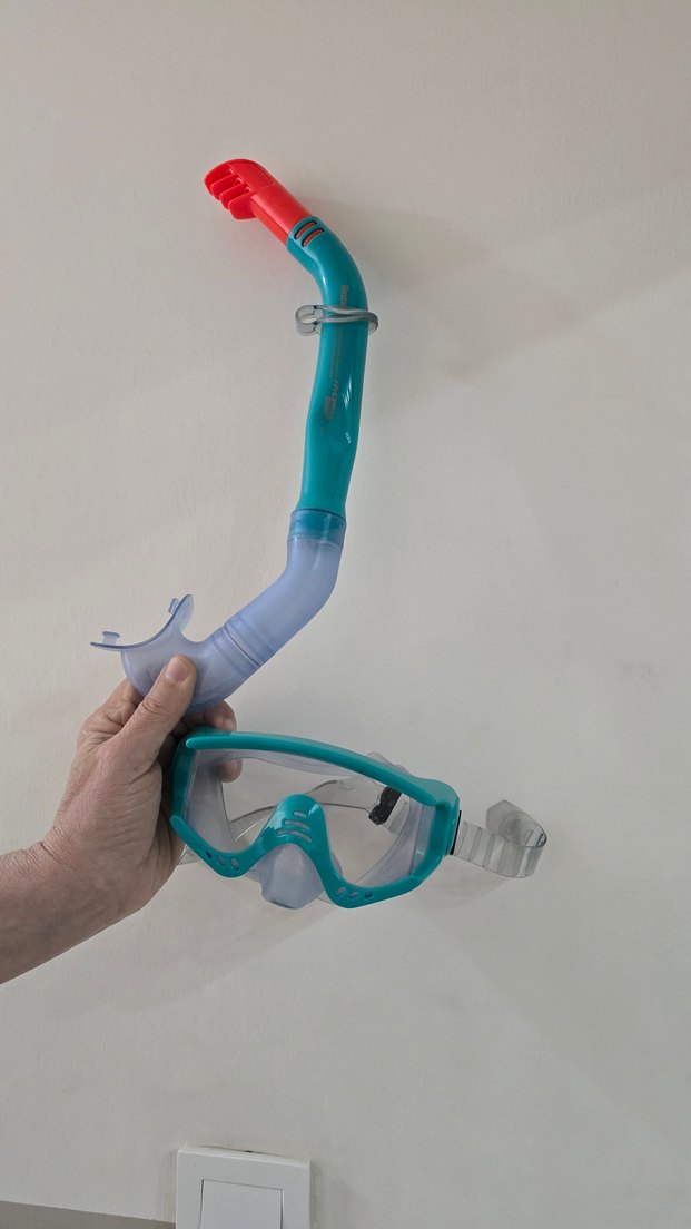 Turkuaz renkli, şeffaf kayışlı, kırmızı uçlu şnorkel ve uyumlu dalgıç gözlüğü seti. 1 kere kullanıldı. Demir kısmında bi tık yamulma var 2.ve3. fotoğrafta gösterdim.