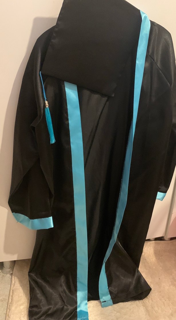 Uzun, regular fit mezuniyet için kep cüppeli seti ; yakası notched lapel, askılı kollu, turkuaz şerit ve püskül detaylı, modern avant-garde tarzda.