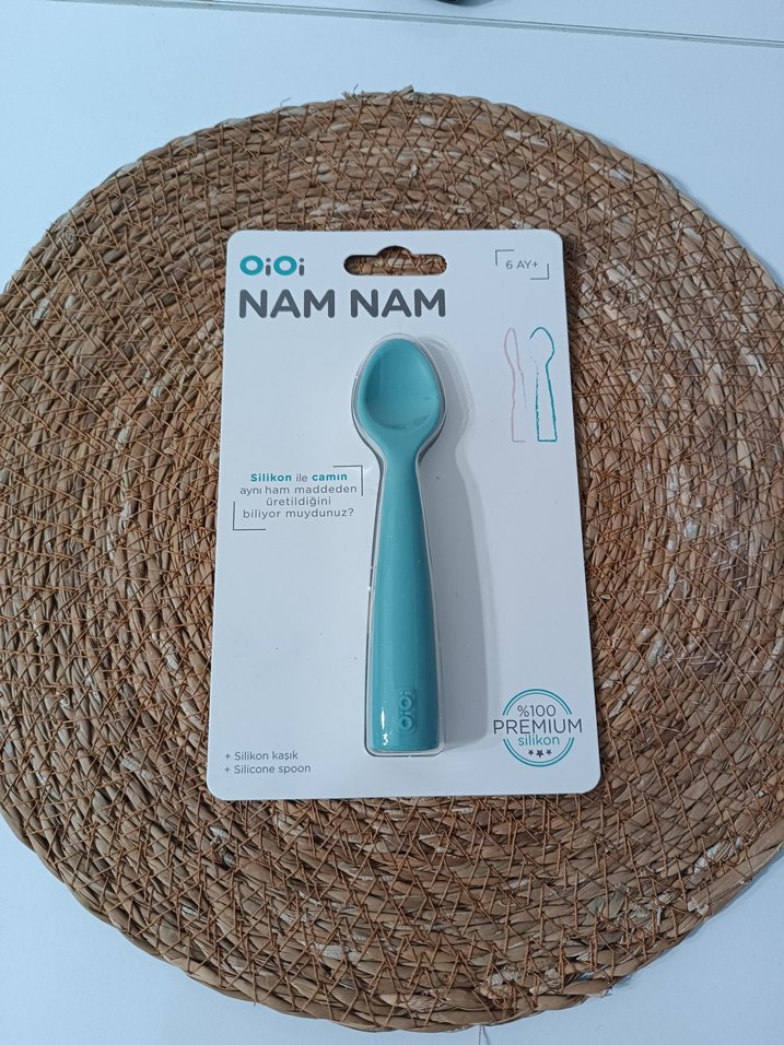 6 ay ve üzeri bebekler için NAM NAM turkuaz silikon kaşık. %100 premium silikon, yumuşak ve güvenlidir.