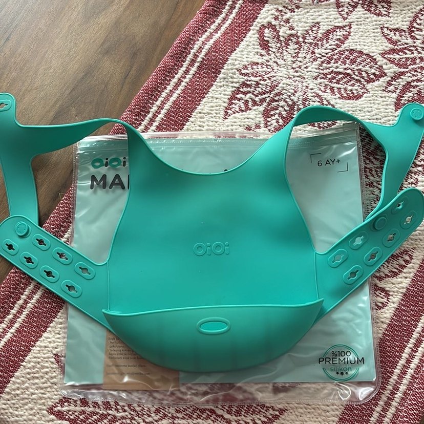 Pastel turkuaz renkte, baskılı desenli silikon bebek önlüğü, 6 aylık ve üzeri bebekler için uygundur. Oioi markalı ve döküntüleri yakalayan cep içerir.