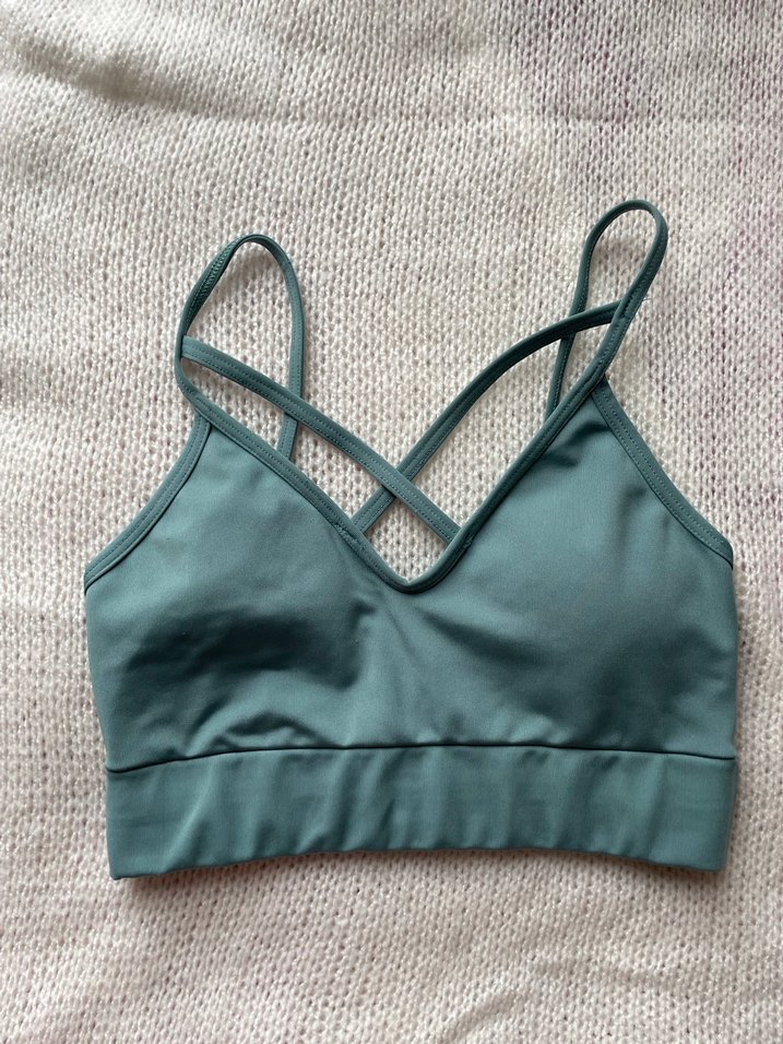 Turkuaz renkte, çapraz askılı ve desen içermeyen spor sütyeni. Normal uzunlukta ve rahat, sokak stiline uygun tasarım.