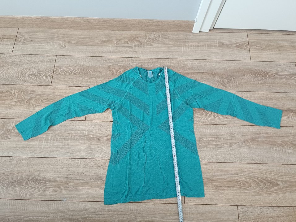 Uzun kollu, yuvarlak yakalı, Turkuaz tonlarında, doğada ve spor yaparken rahat kullanım sağlar. Unisex kullanılabilir. Odlo spor markası.