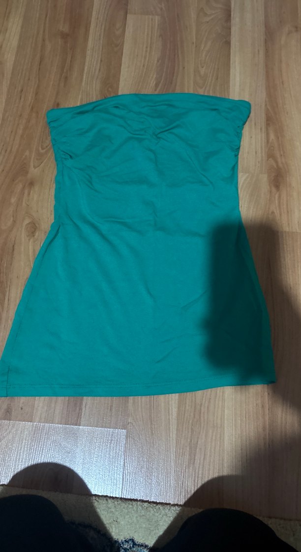 Turkuaz renkli, straplez ve kolsuz, vücuda oturan. Sentetik kumaştan yapılmış, sade ve bohem tarzda günlük kullanım için uygun.