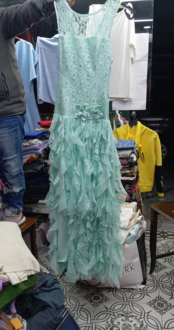 Turkuaz renkte, straplez ve vücuda oturan uzun abiye elbise, desenli kumaş ve kat kat fırfır detaylarıyla dikkat çekiyor.