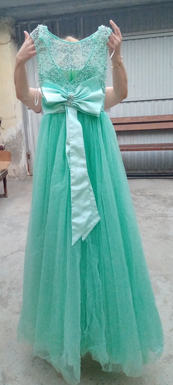 Turkuaz renkte, straplez, drapeli ve beli büyük fiyonk detaylı, uzun ve şık abiye elbise. Düğün ve özel davetler için uygundur.