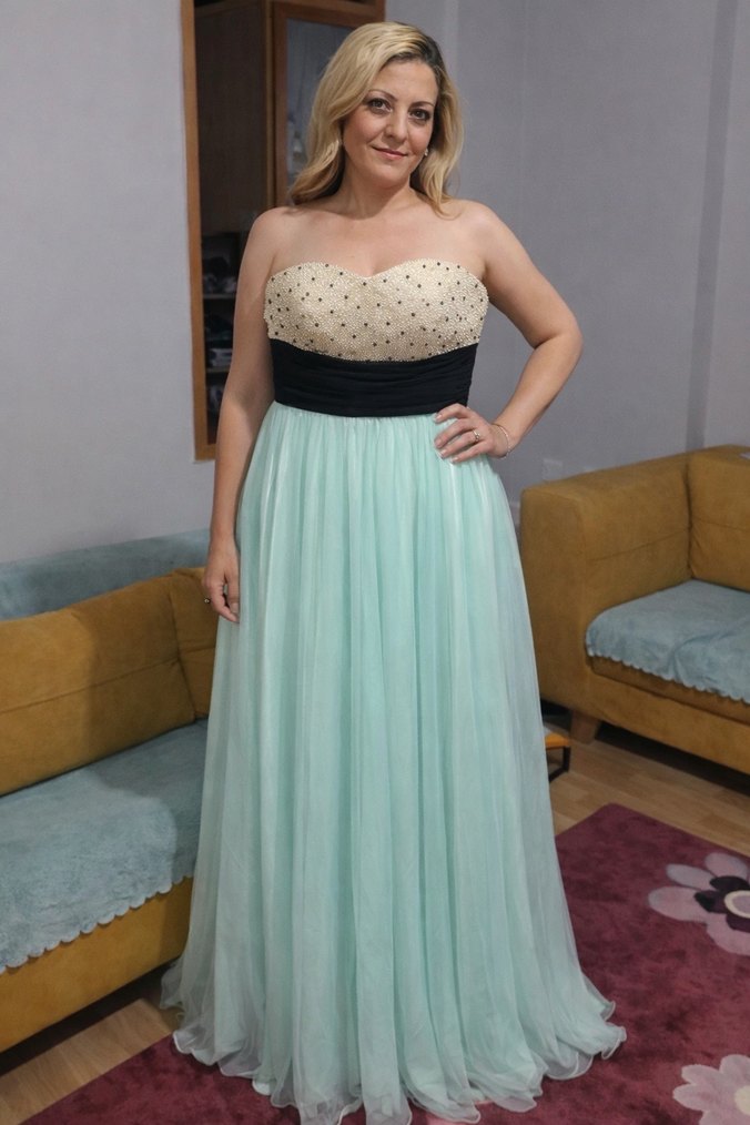 Bu oturan kesim uzun abiye elbise, straplez yaka ve pileli etek detaylarıyla turkuaz renkte klasik zarafeti modern dokunuşla birleştirir. Düğün ve özel davetler için uygundur.