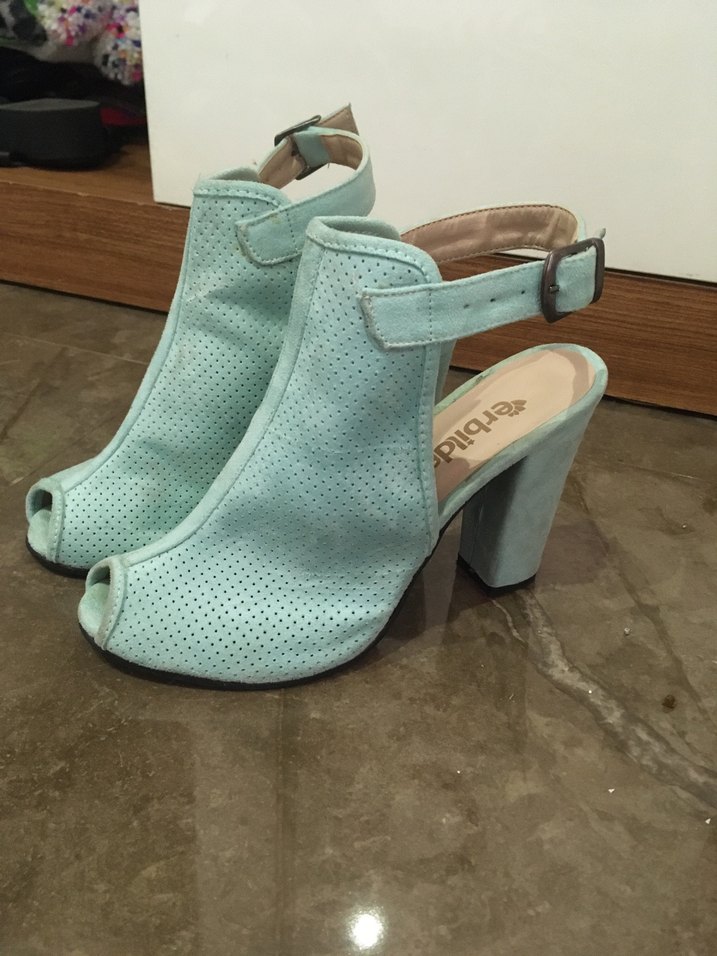 Turkuaz Süet Tokalı Blok Topuklu Kadın Sandalet