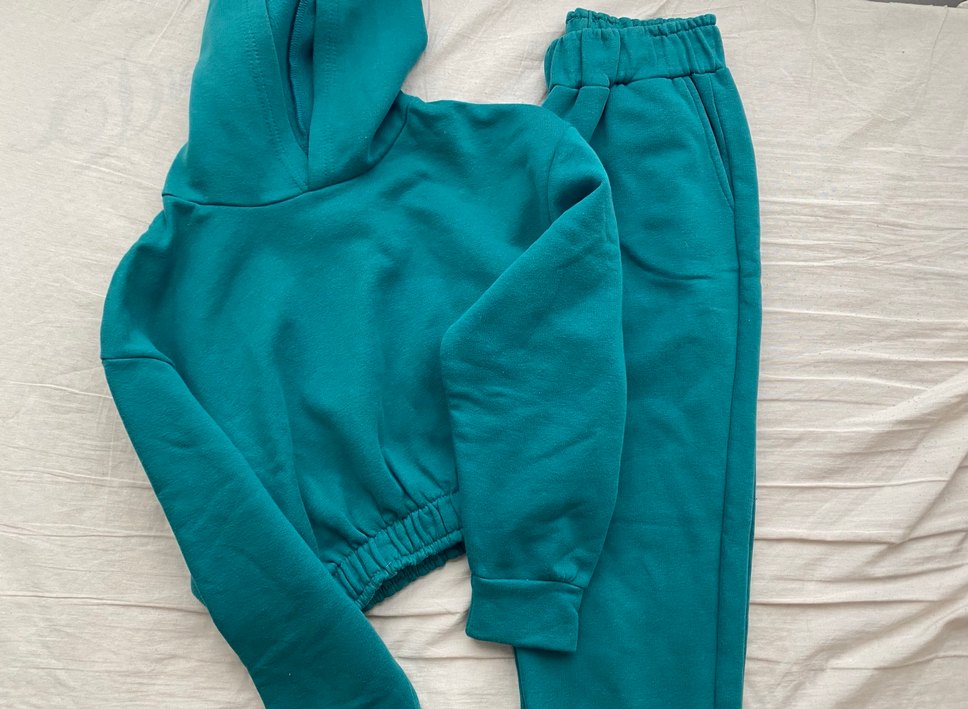 turkuaz renkli, bol kesim sweatshirt ve eşofman takımında uzun kollu, yuvarlak yaka sweatshirt ve rahat eşofman altı bulunur. Yumuşak ve sıcak kumaştan üretilmiştir.