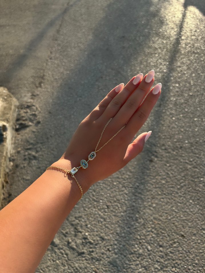 Turkuaz renkli, Taş deseni ve zincir detaylı kadın el zinciri. Bohem ve minimalist tarza uygun.