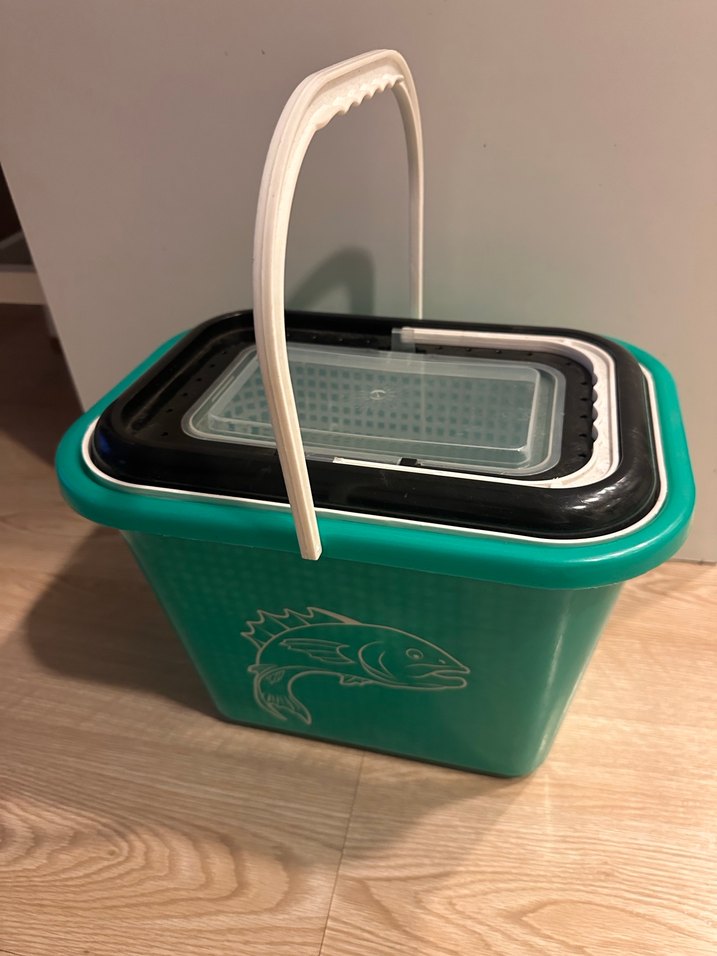 Turkuaz renkte, beyaz tutma saplı ve siyah kapaklı taşınabilir kutu. Yanında balık figürü bulunur. Taşıması kolaydır.