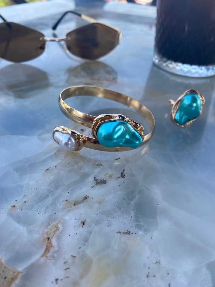 Parlak turkuaz taş ve inci detaylı, altın renkli bohem bilezik, günlük kullanıma uygun.