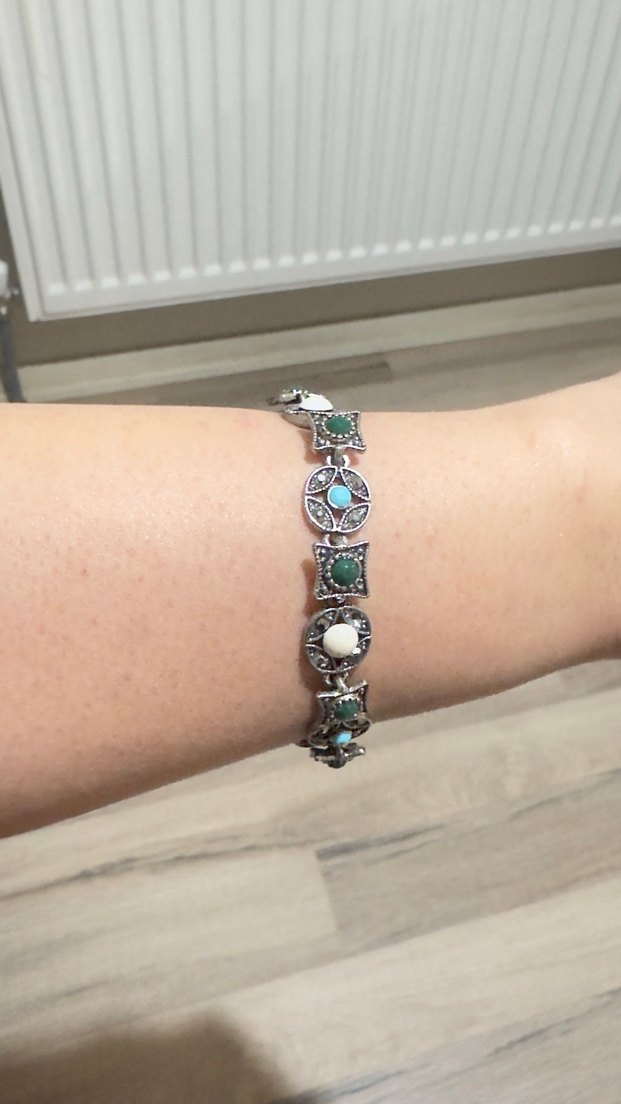 Gri tonlarda yılan desenli, turkuaz ve beyaz boncuklu bohem tarzı bileklik, günlük kullanım için uygundur. Teklif verin