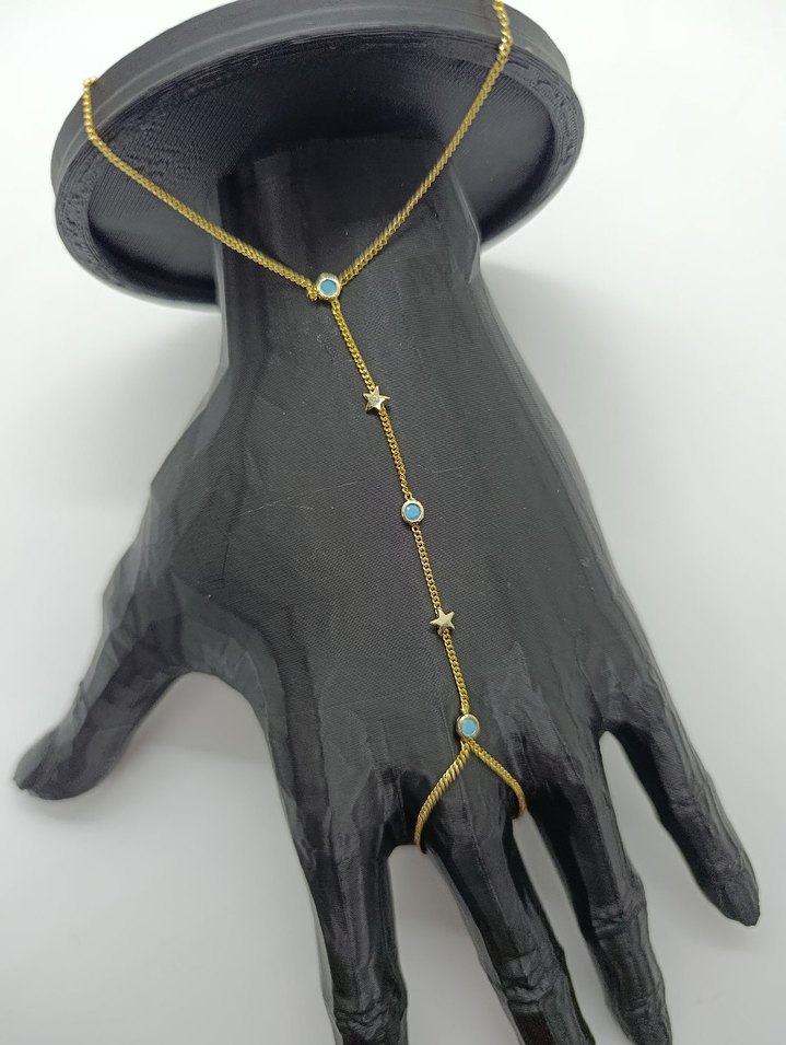 Turkuaz taşlı, zincir detaylı bohem tarzı kadın el zinciri. Yıldız süslemeleri ve nakışlı deseniyle günlük kullanıma uygundur. ✨