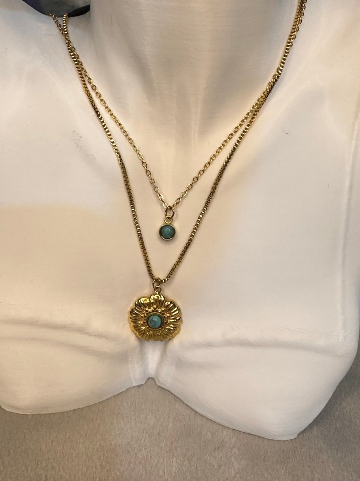 Turkuaz Taşlı Çiçek Detaylı İkili kolye