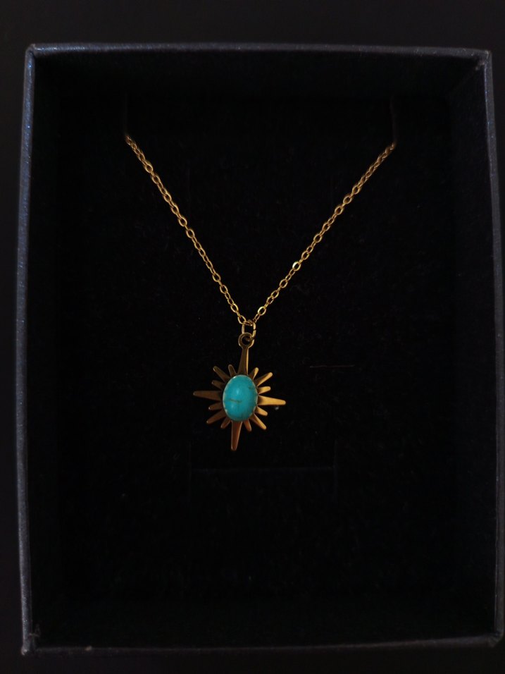 Altın renkli zincir ve güneş şeklinde turkuaz taşlı mini bohem kolye, günlük kullanım için uygundur.