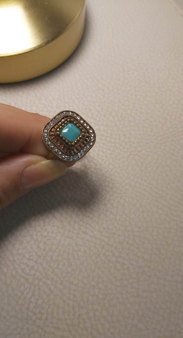 Parıltılı turkuaz taşın çevresinde desenli payet detayları bulunan bohem tarzda vintage yüzük. Günlük kullanım için özgün bir dokunuş sağlar.