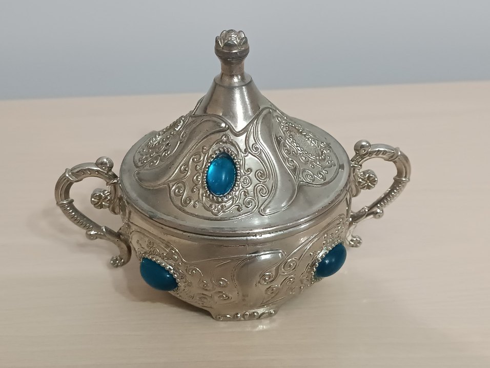 taşları eksik, kusurlu..parlak gümüş detaylara sahip, canlı turkuaz taşlarla süslenmiş klasik tasarımlı çaydanlık.