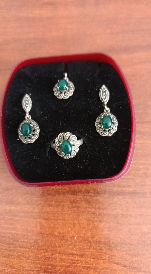 Bu vintage tarz kadın takı seti, boncuklu ve nakışlı detaylarla süslenmiş koyu turkuaz taşlar içerir, düğünler için bohem şıklık sunar. Midyat gümüşüdür yüzük kısmı kaynak yapılması lazım.