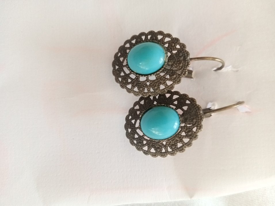 Turkuaz taşlı, işlemeli metal detaylı vintage tarz kısa uzunlukta, boncuklu mini küpeler. Bohem ve retro tarzlar için uygun, düğünlerde kullanılabilir.