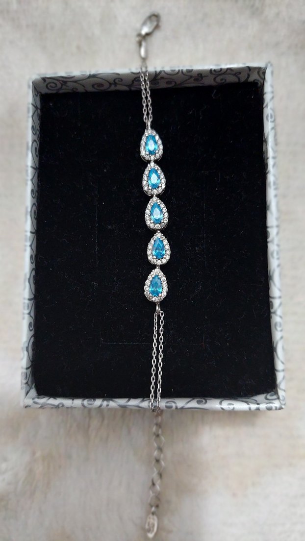 Kadın bilekliğinde beş turkuaz damla taş ve zincir detayları bulunur 925 ayar gumus bileklik