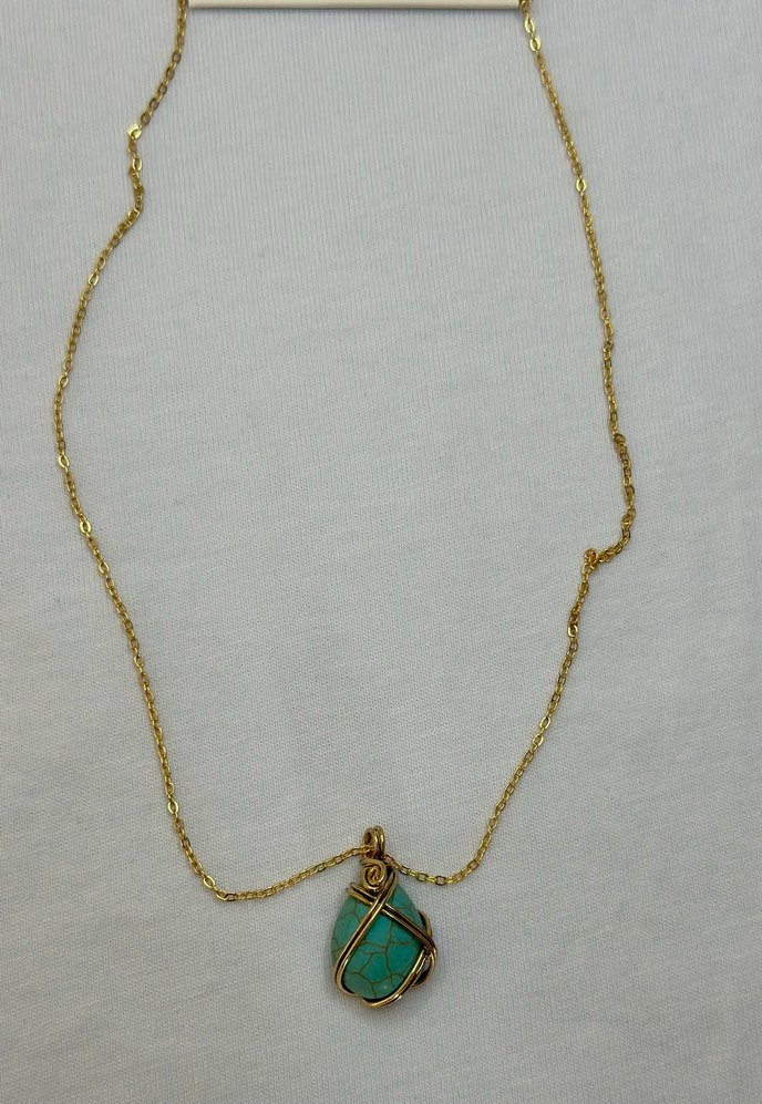 Bohem tarzda, turkuaz taşın detaylı tel sarımı ile süslendiği altın renkli zincir kolye, normal midi uzunlukta. Günlük kullanım için uygun.