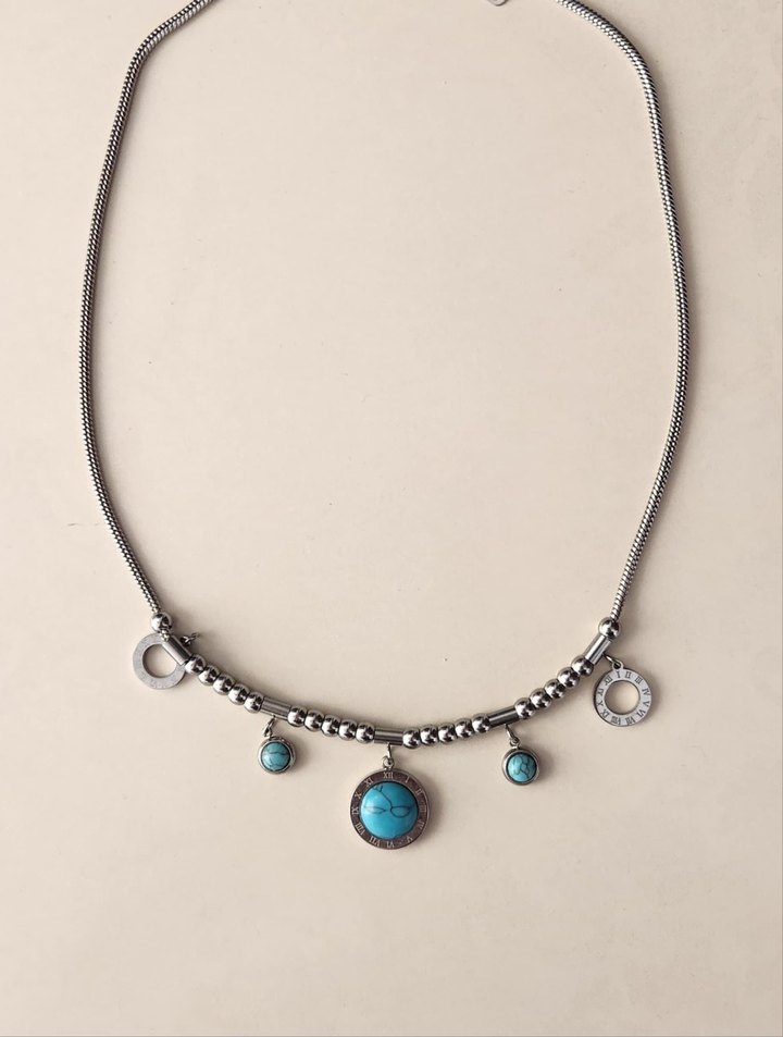 Bohem tarzda, zincir detaylı turkuaz taşlı normal uzunlukta kolye, günlük kullanıma uygundur.