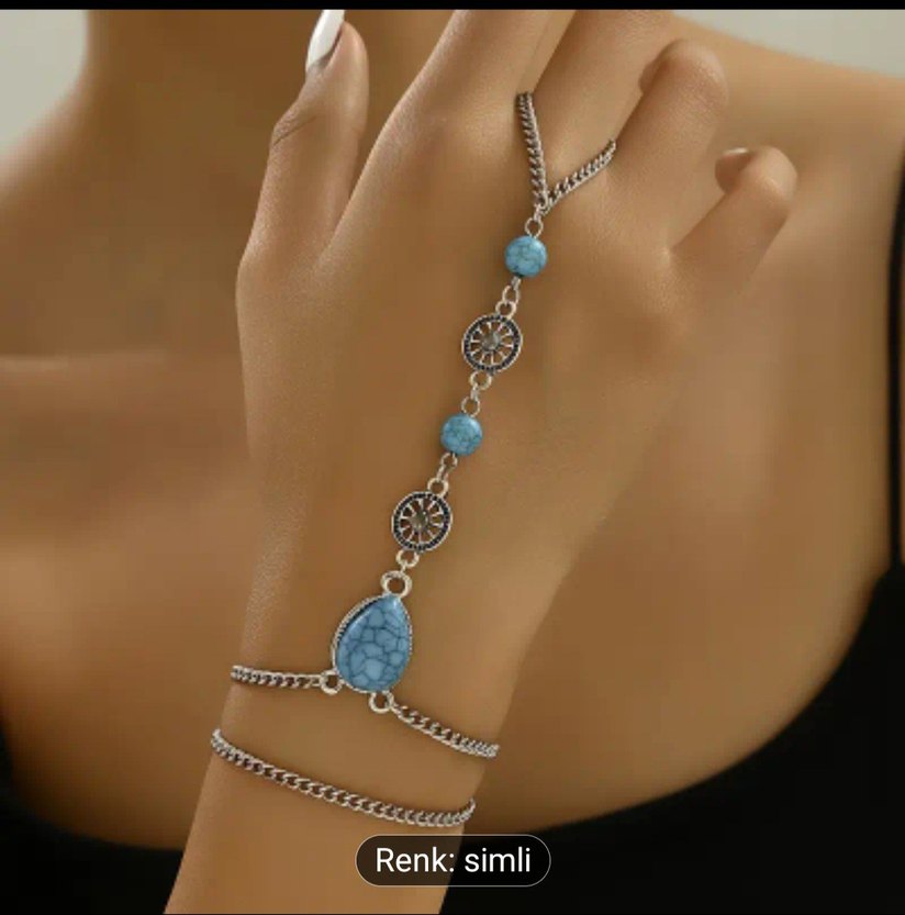 Bohem tarzda, turkuaz taşlar ve zincir detaylarıyla kadın el zinciri, günlük kullanım için uygun retro bir tasarım.