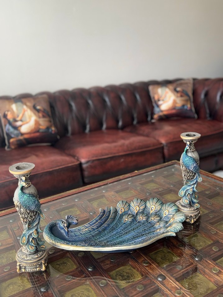 İki turkuaz tavuskuşu şeklinde mumluk ve detaylı tüy desenli tabaktan oluşan zarif dekoratif set.️tamamen elde boyanmıştır 3 kat verniklidir