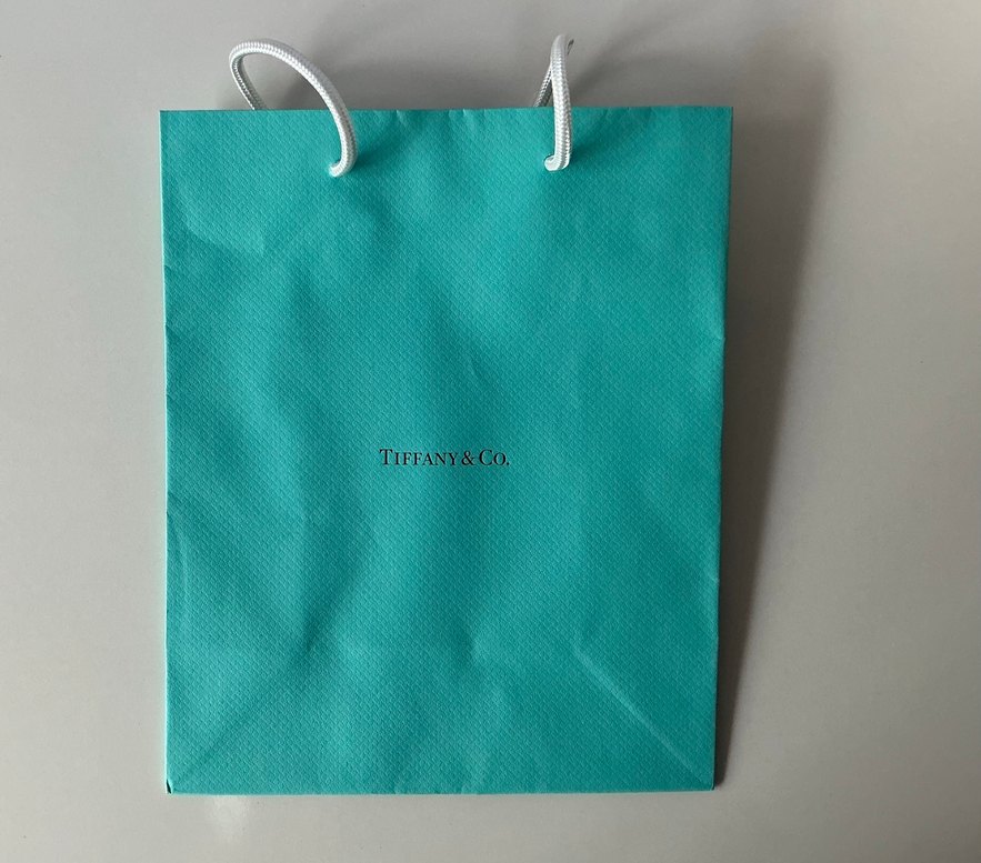Turkuaz renkli, parlak yüzeyli kağıt çanta. Üzerinde Tiffany&Co. baskısı ve beyaz ip saplar bulunur. Minimalist, şeffaf tasarıma sahiptir. ölçüleri 20*24,5 cm olup herhangi bir sorunu yoktur.