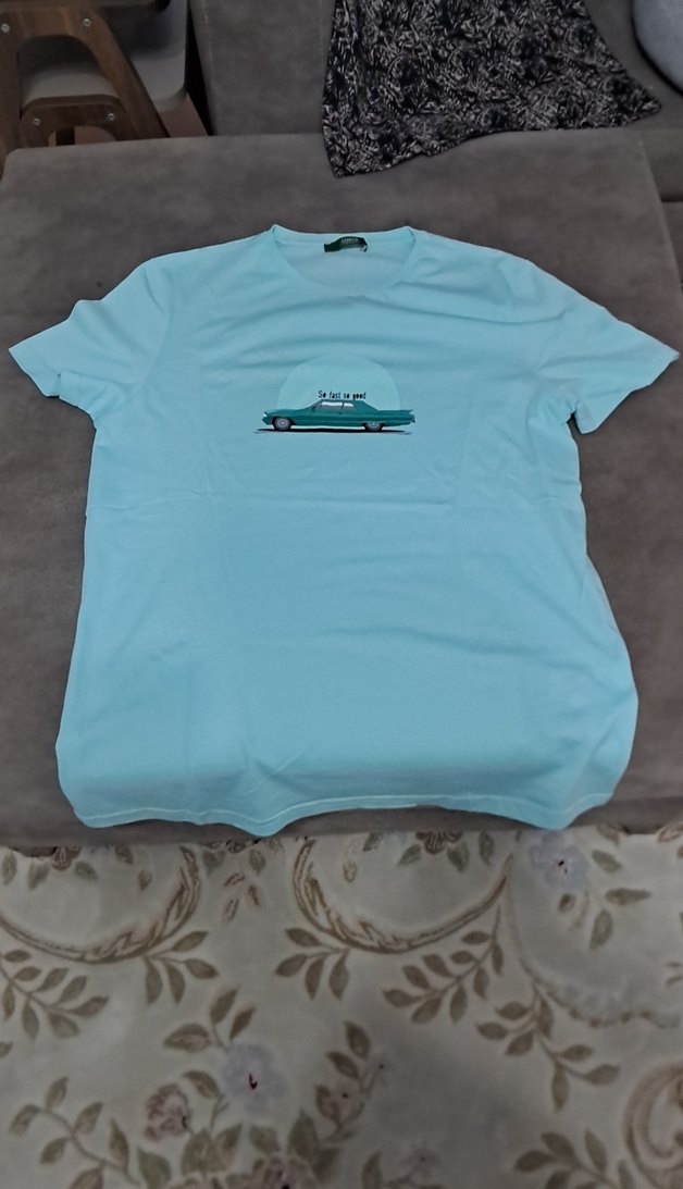 Turkuaz renkli, kısa kollu ve yuvarlak yakalı pamuklu, düğmeli, baskılı, bol kesim tişört