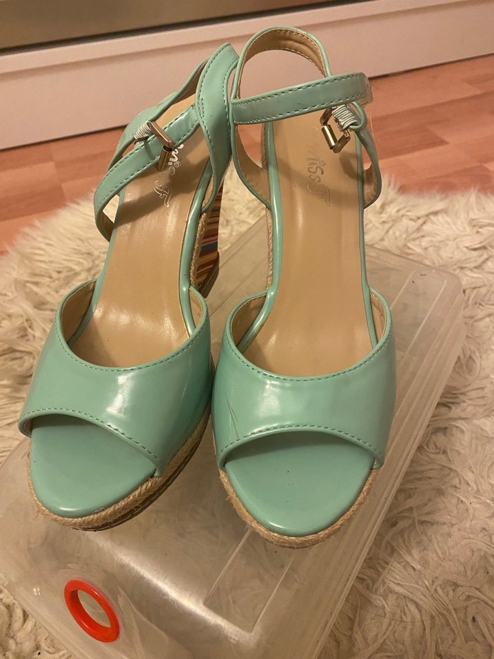 Turkuaz renkte, tokalı bantlı dolgu topuklu kadın ayakkabı. Kauçuk malzemeden, sade ve bohem tarzıyla günlük kullanıma uygun. Defosu yoktur.