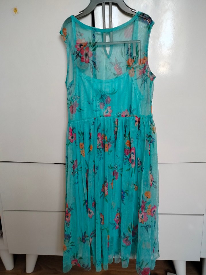 Turkuaz renkli, transparan detaylı, çiçek desenli, askısız uzun bohem elbise. Rahat kesimli ve sentetik kumaştan üretilmiştir, parti için uygundur.