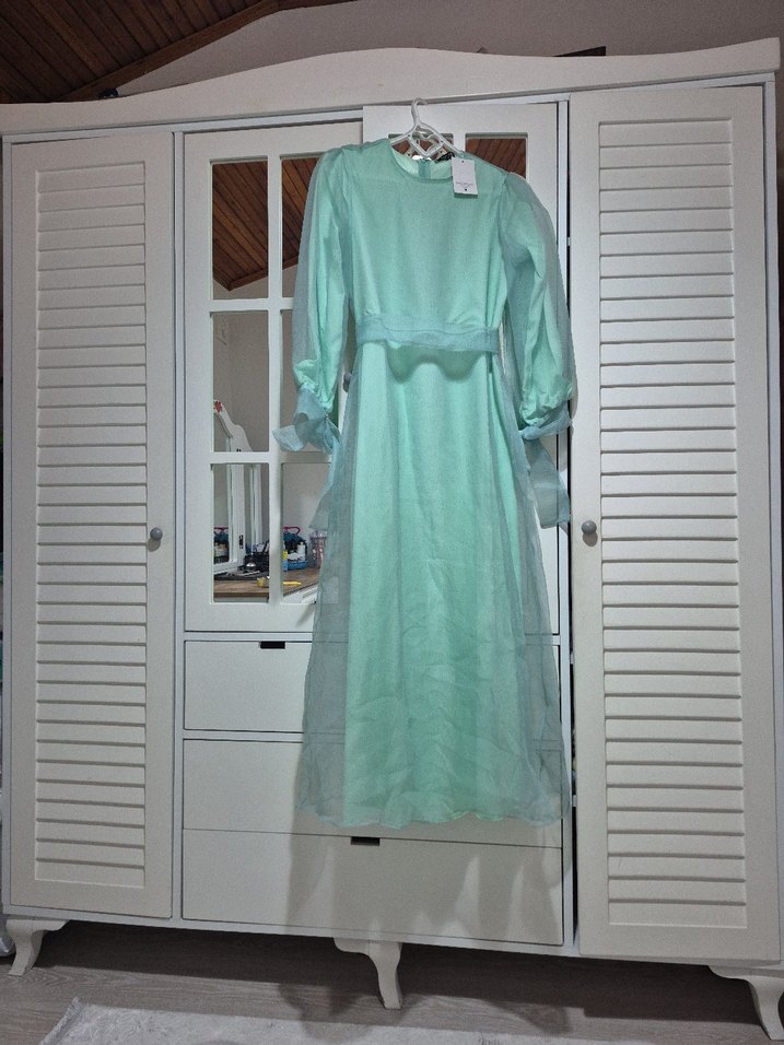 Turkuaz renkte, transparan uzun kollu ve yuvarlak yakalı, bol kesim uzun elbise. Yumuşak sentetik kumaştan yapılmıştır, günlük kullanım için uygundur. 2 beden yazıyor