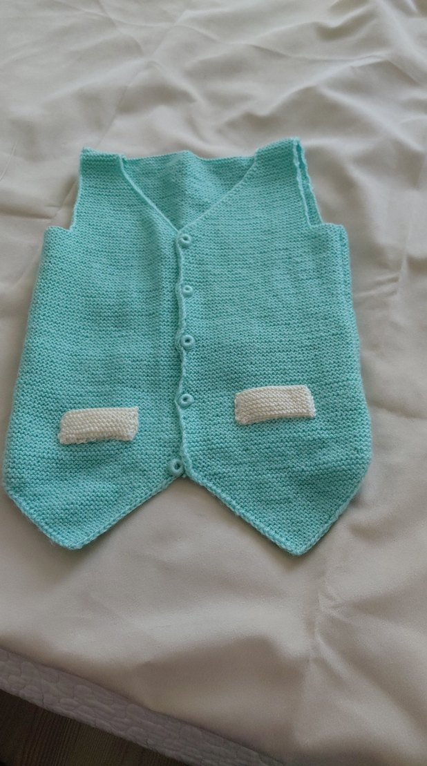 Turkuaz renkli, triko örme erkek çocuk yeleği, V yakalı ve kolsuzdur. Pastel tonlarda, küçük beyaz ceplerle sade ve bohem tarzda tasarlanmıştır.