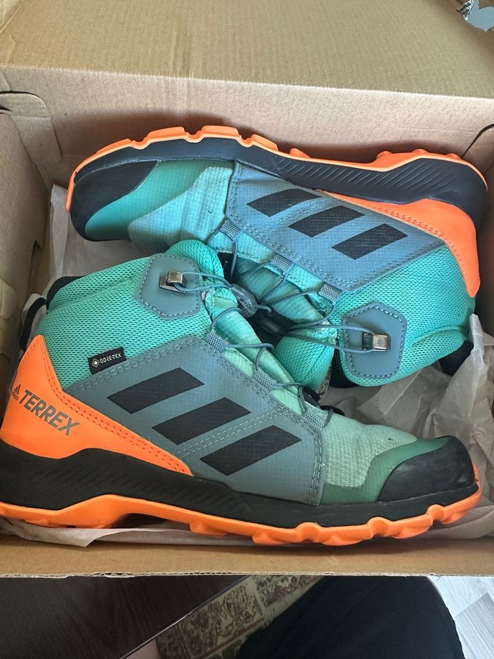 Turkuaz ve turuncu renklerde, kauçuk tabanlı, baskılı desenli ve velcro bağlamalı Terrex outdoor erkek ayakkabısı. Sokak giyimine uygun.