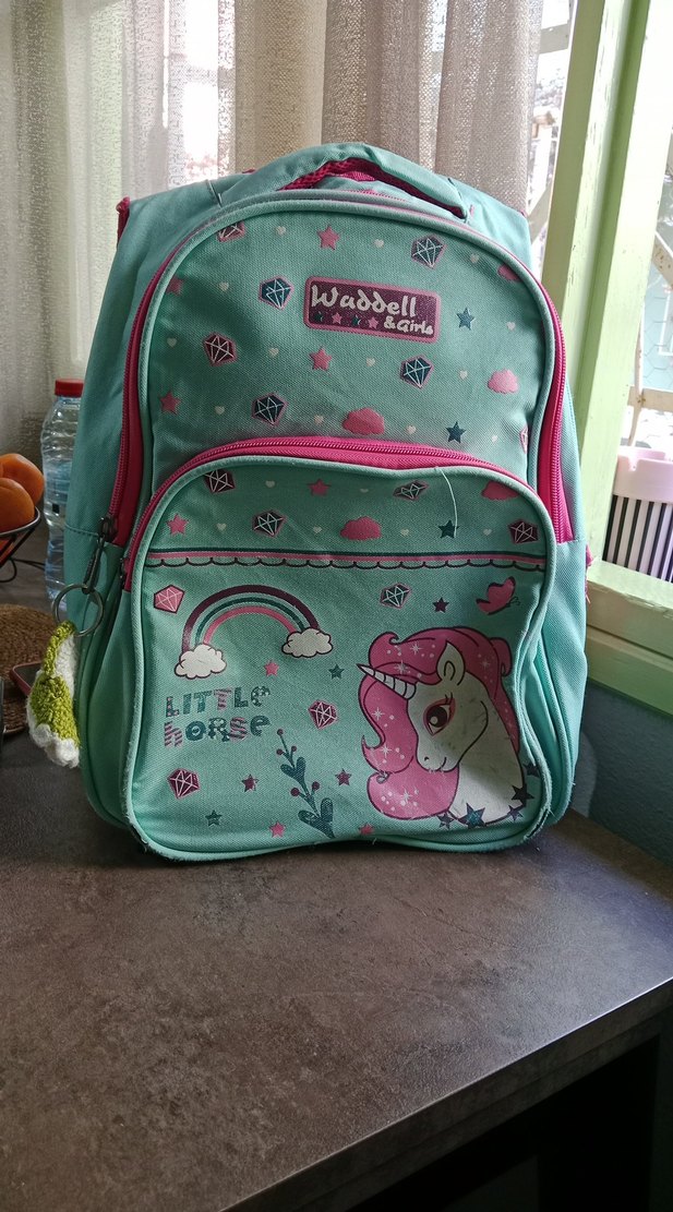 Turkuaz renkli, pastel tonlarda unicorn ve gökkuşağı desenli, çok bölmeli Waddell markalı çocuk okul çantasıdır. deforme olan yer gözükmüyor kullanıma engel değil fermuarlari her yeri sağlam