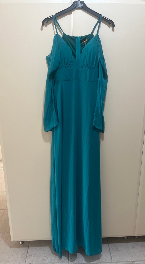 uzun gece elbisesi, V yakalı ve uzun kollu, kolları düşük, Koyu turkuaz renkte