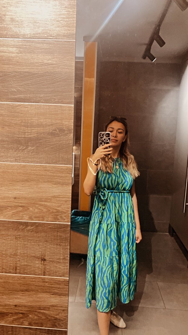 Turkuaz tie-dye desenli, püsküllü, askılı, bol kesim uzun elbise. Yumuşak sentetik kumaştan, bohem tarz için uygun.