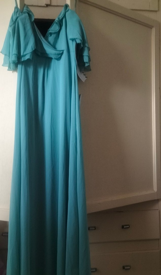 Turkuaz renkli, uzun ve drapeli tasarıma sahip, V yakalı, kolsuz ve salaş kesim kadın abiyesi. Vintage ve modern klasik stilin birleşimi, düğünler için uygun.