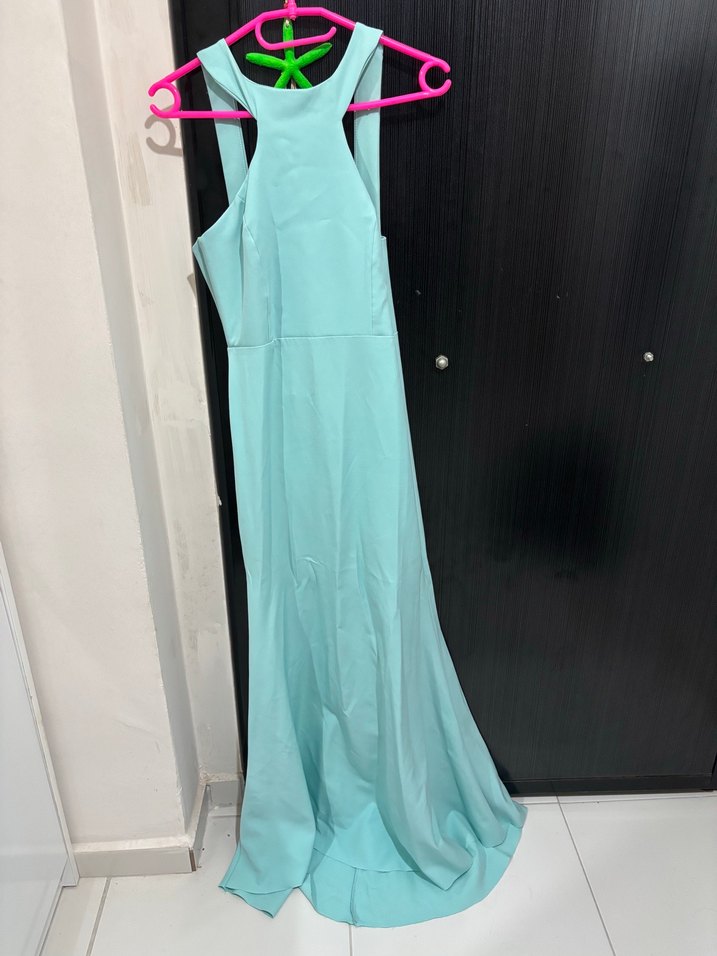 Drapeli detaylara sahip, askısız ve kolsuz uzun elbise. Pastel turkuaz renkte, sentetik kumaştan, minimal ve çağdaş stil için uygun. Düğünlere ideal. Kusuru yok sadece 1 kez kullanıldı Kemerli kemersiz kullanılabılır Ben S bedenim , S bedene daha uyumlu