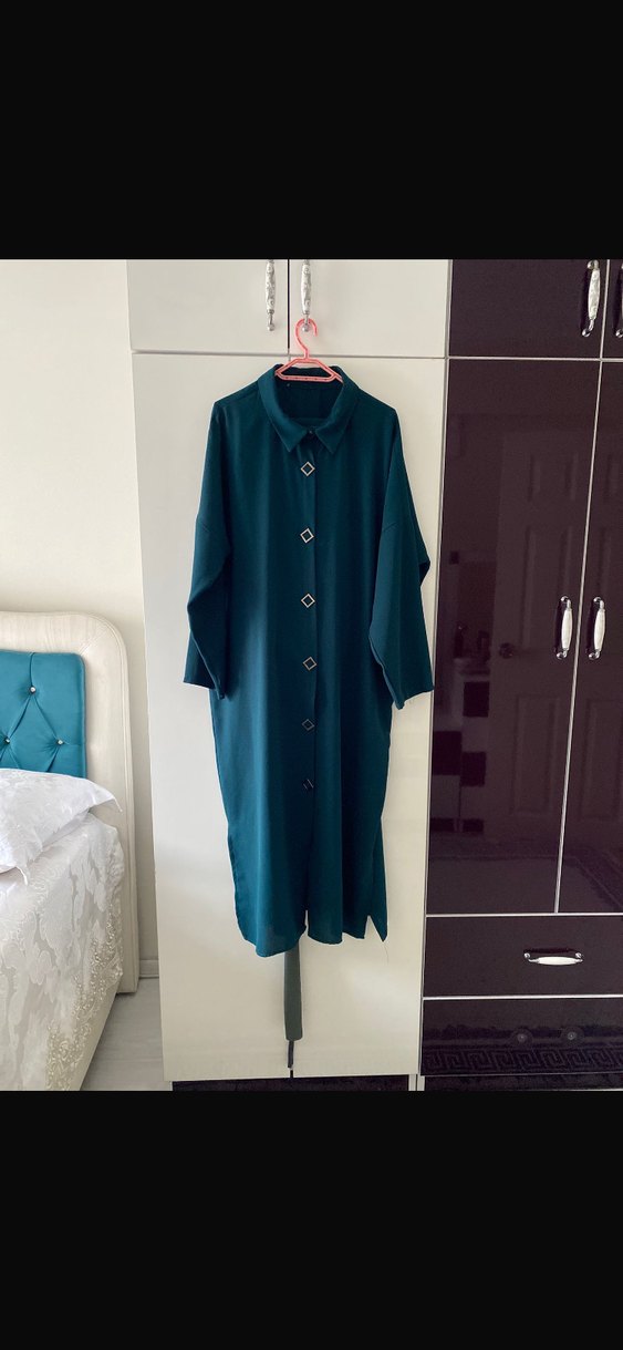 Turkuaz renkte, uzun boylu, düğmeli hUzun kollu, keskin yakalı ve minimalist tarzda, günlük kullanıma uygundur