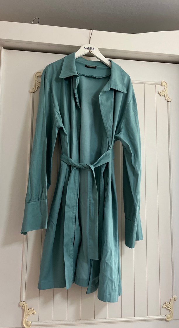 Turkuaz uzun ince kap, bol kesim ve drapeli tasarıma sahiptir. Notlu yaka ve uzun kolludur, ofis için uygundur. Boy:93cm